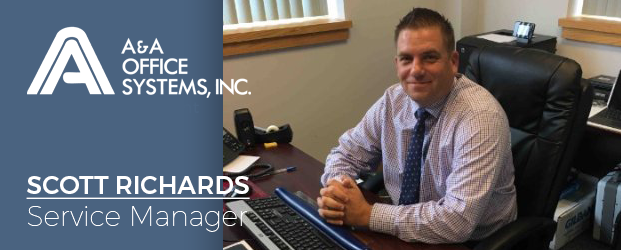“It’s not the customer’s problem. It’s our problem,” says Scott Richards, A&A’s Service Manager. Scott has been with with A&A Office Systems for over 14 years, 10 of which have been in the service manager role. Leaning back in his chair, Scott recounts his early years with the company as a copier service technician with a sense of pride. He attributes his rise to management to his enjoyment of turning bad situations around. “Rushing in like a fireman,” as he puts it.
